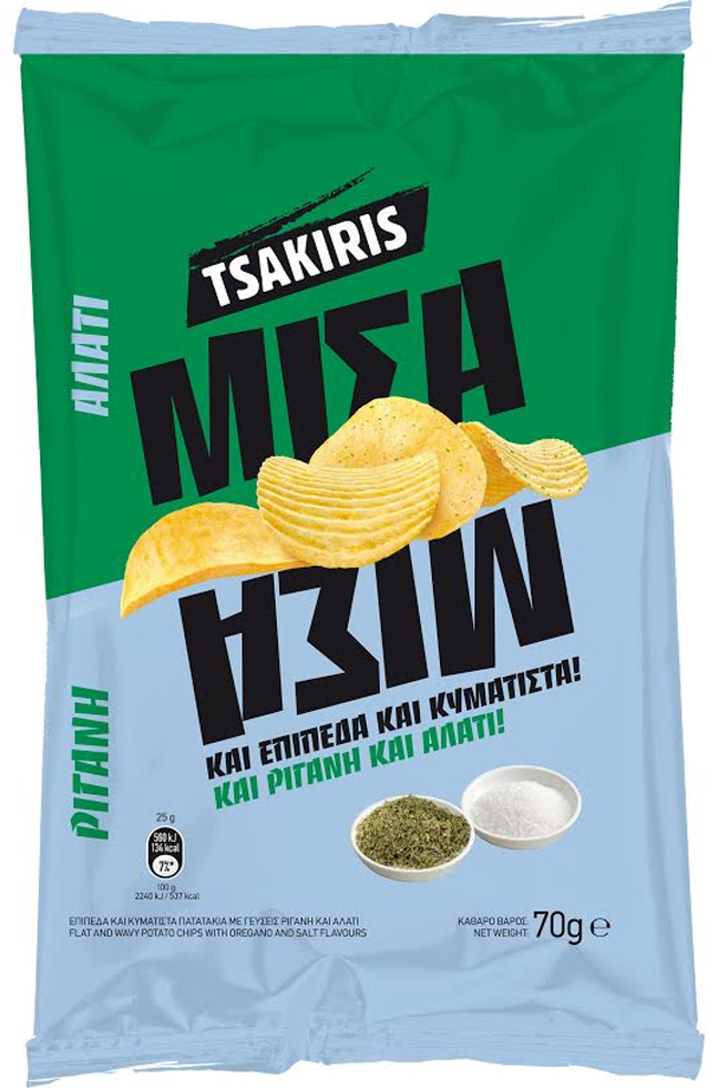 Tσακίρης ΜΙΣΑ-ΜΙΣΑ Αλάτι & Ρίγανη: Ο κλασικός συνδυασμός που λατρεύουμε, σε κυματιστό και επίπεδο σχήμα μαζί σε μια συσκευασία! Συνοδεύει ιδανικά κάθε στιγμή μας στο σπίτι, το γραφείο, το δρόμο!