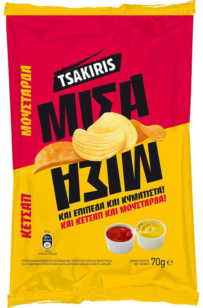 Tσακίρης ΜΙΣΑ-ΜΙΣΑ Κέτσαπ & Μουστάρδα: Κέτσαπ ή μουστάρδα; Μουστάρδα ή κέτσαπ; Κυματιστό ή επίπεδο; Με τα Tσακίρης ΜΙΣΑ- ΜΙΣΑ δεν έχουμε πια δίλημμα! Αναπάντεχος γευστικός συνδυασμός για όσους προτιμούν τις πιο πικάντικες γεύσεις. Υπέροχα, τραγανά chips με γεύση κέτσαπ και μουστάρδας, δημιουργούν έναν απολαυστικό συνδυασμό που ικανοποιεί ακόμα και τους πιο απαιτητικούς.