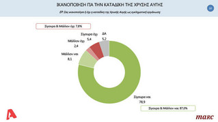 Ικανοποιημένη φαίνεται πως είναι η κοινωνία από την καταδίκη της Χρυσής Αυγής σύμφωνα με δημοσκόπηση που πραγματοποιήθηκε από την εταιρεία Marc για λογαριασμό του κεντρικού δελτίου του Alpha και προβλήθηκε το απόγευμα της Πέμπτης.