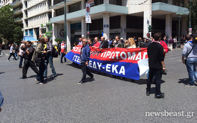 Πορεία προς τη Βουλή κάνουν αυτή την ώρα οι απεργοί της ΓΣΕΕ και ΑΔΕΔΥ που συμμετέχουν στην απεργιακή συγκέντρωση των συνδικάτων για την Εργατική Πρωτομαγιά.