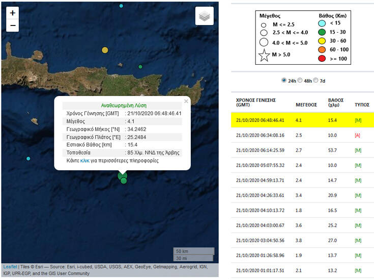 Το επίκεντρο εντοπίζεται στον θαλάσσιο χώρο 85 χιλιόμετρα νότια/νοτιοδυτικά της Άρβης στην Κρήτη, σε απόσταση 435 χιλιόμετρα νότια/νοτιοανατολικά της Αθήνας, και το εστιακό βάθος προσδιορίζεται στα 15,4 χιλιόμετρα.