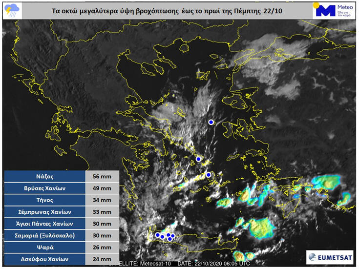 Για το υπόλοιπο της ημέρας βροχές και καταιγίδες θα εκδηλωθούν στις Κυκλάδες, στην Κρήτη και στα Δωδεκάνησα, φαινόμενα που το απόγευμα θα περιοριστούν στην Κρήτη, όπου θα επιμείνουν έως τις πρωινές ώρες της Παρασκευής 23/10.