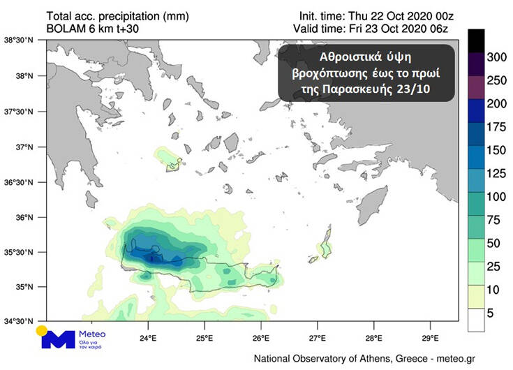 Στον προγνωστικό χάρτη που ακολουθεί αποτυπώνονται τα εκτιμώμενα αθροιστικά ύψη βροχόπτωσης έως το πρωί της Παρασκευής 23/10.