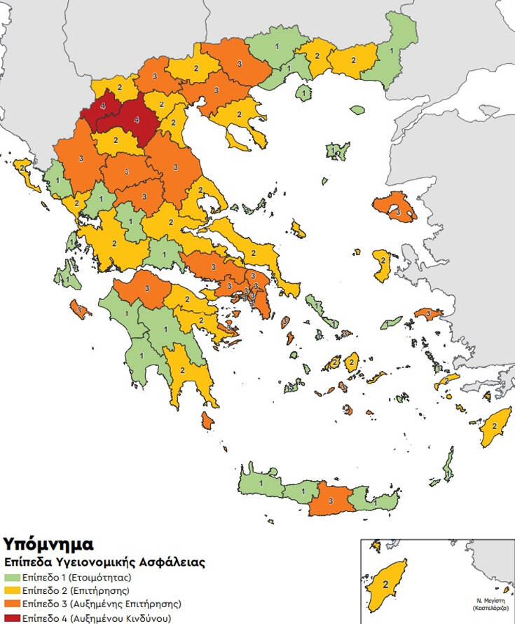 Πιο συγκεκριμένα περιφερειακές ενότητες εντάσσονται στα εξής επίπεδα: Επίπεδο 1 – Ετοιμότητας, Επίπεδο 2 – Επιτήρησης, Επίπεδο 3 – Αυξημένης Επιτήρησης και Επίπεδο 4 – Αυξημένου Κινδύνου.