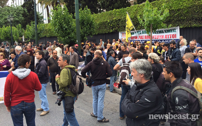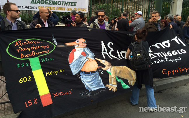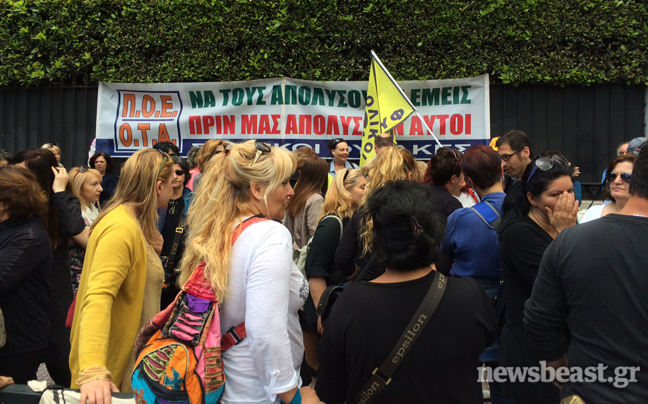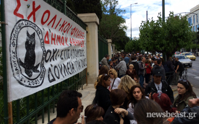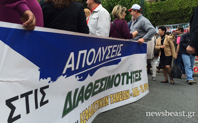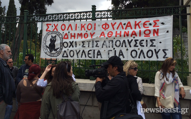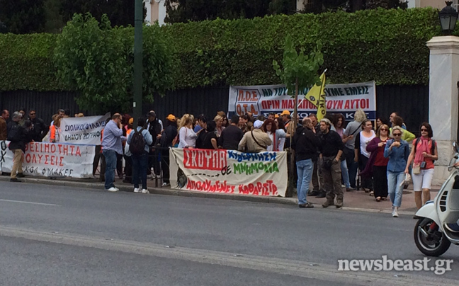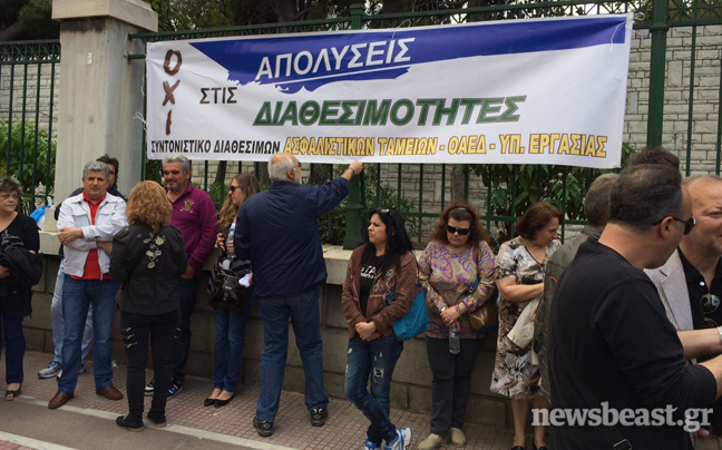 Συγκεντρωμένοι έξω από το υπουργείο Διοικητικής Μεταρρύθμισης είναι αυτή την ώρα σχολικοί φύλακες και απολυμένες καθαρίστριες του υπουργείου Οικονομικών που διαμαρτύρονται για το μέτρο της διαθεσιμότητας.
