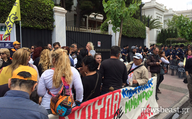 Κατά διαστήματα οι συγκεντρωμένοι κατεβαίνουν από το πεζοδρόμιο στη λεωφόρο Βασιλίσσης Σοφίας με αποτέλεσμα η κυκλοφορία να διεξάγεται με προβλήματα.