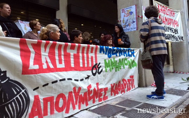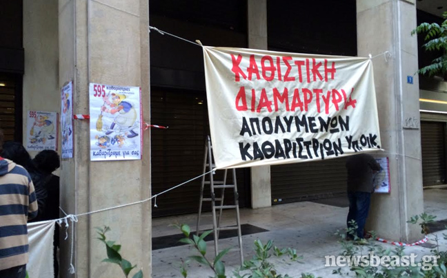 Τα 15 άτομα, μεταξύ των οποίων δύο από την Κέρκυρα και δύο από το Βόλο, κρατούν πανό και διαμαρτύρονται. Σε 11 μέρες τελειώνει το καθεστώς διαθεσιμότητας των 595 καθαριστριών που υπάρχουν πανελλαδικά.