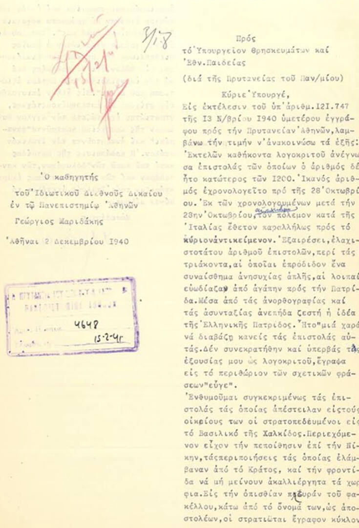 «Θα μπορούσα να σταθώ σε πολλά τεκμήρια, επιτρέψτε μου όμως να σταθώ σε ένα, μια από τις χιλιάδες ”μικρές” ιστορίες που φιλοξενεί το Ιστορικό Αρχείο. Χρονολογείται τον Σεπτέμβριο του 1941 και είναι η επιστολή ενός πατέρα, ο οποίος θα απευθυνθεί στον Πρύτανη λόγω της σύλληψης του γιού του από τους Ιταλούς. Το αίτημα είναι διπλό: αφενός να γίνει δεκτός παρά την καθυστερημένη εγγραφή του και αφετέρου να μεσολαβήσει το Πανεπιστήμιο για την απελευθέρωσή του. Το έγκλημα του φοιτητή ήταν το ότι σιγοτραγούδησε την ιταλική ”Χωριατοπούλα”, δηλαδή το «Κορόιδο Μουσολίνι», όπως είχε μεταφερθεί στην ελληνική γλώσσα. Σημειώνω ότι σύντομα πολλά από αυτά τα τεκμήρια θα αποτελέσουν μέρος ενός ψηφιακού μουσείου για την περίοδο, χάρη στην υποστήριξη του Κοινωφελούς Ιδρύματος Κοινωνικού και Πολιτιστικού Εργου (ΚΙΚΠΕ)».