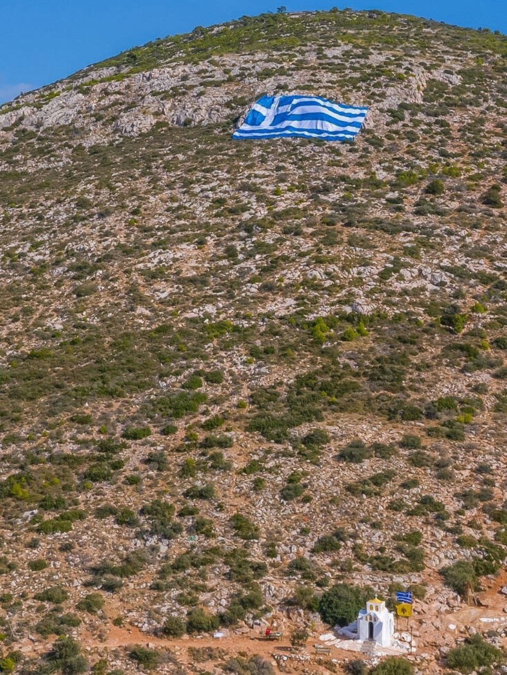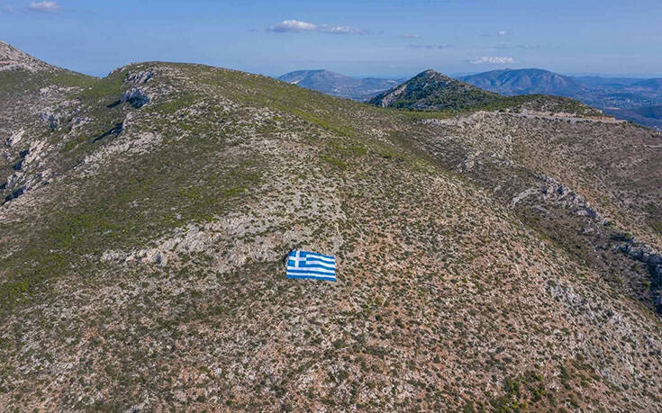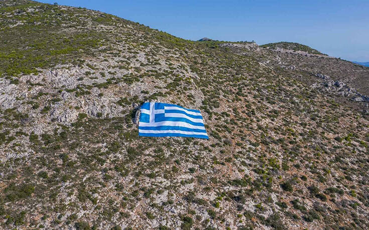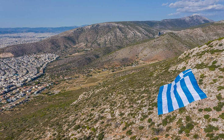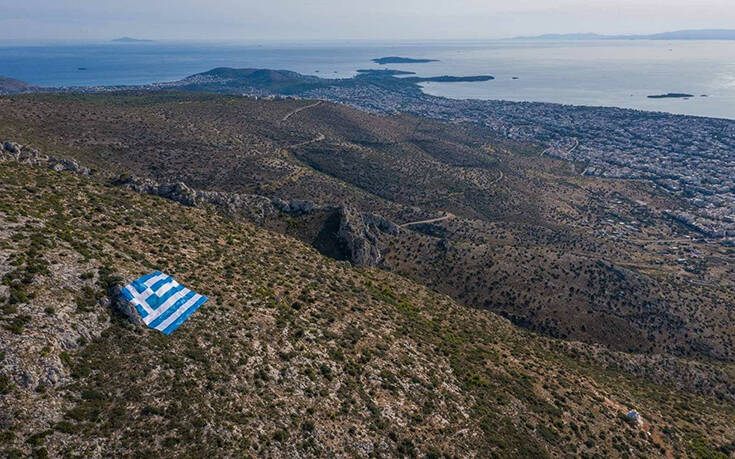 Μία τεράστια ελληνική σημαία 800 τετραγωνικών τοποθετήθηκε στην πλαγιά του Υμηττού με πρωτοβουλία του δημάρχου Γλυφάδας, Γιώργου Παπανικολάου.