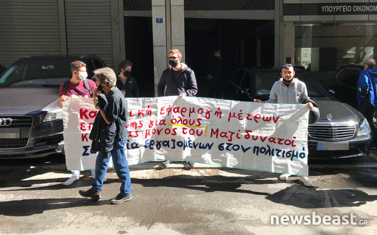 Για «μέτρα ψίχουλα» κάνουν λόγο οι επαγγελματίες της τέχνης, οι οποίοι πραγματοποιούν συγκέντρωση έξω από το υπουργείο Οικονομίας δείχνοντας την αντίθεσή τους κατά της κυβέρνησης και εστιάζοντας στην αποζημίωση ειδικού σκοπού του Σεπτεμβρίου και του Οκτωβρίου.