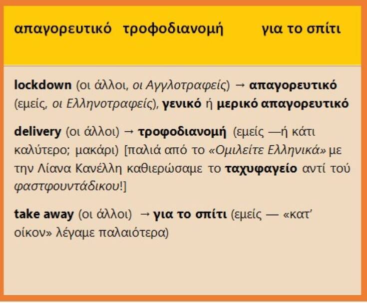 Ο πρώην πρύτανης στο Εθνικό και Καποδιστριακό Πανεπιστήμιο και καθηγητής Γλωσσολογίας, Γιώργος Μπαμπινιώτης, προτιμάει τις ελληνικές λέξεις για τους όρους «lockdown», «delivery» και «take away».
