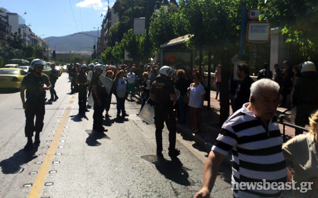 Ένταση μεταξύ των σχολικών φυλάκων και της αστυνομίας επικράτησε έξω από το υπουργείο Διοικητικής Μεταρρύθμισης.
