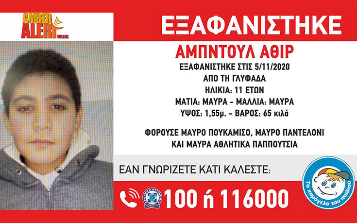 Την Πέμπτη 5/11 στις 18:30, εξαφανίστηκε από την περιοχή της Γλυφάδας Αττικής, ο Αμπντούλ Αθίρ, 11 ετών. Το Χαμόγελο του Παιδιού ενημερώθηκε για την εξαφάνιση του ανήλικου Αμπντούλ Αθίρ, σήμερα στις 6/11 και προχώρησε άμεσα στην ενεργοποίηση του μηχανισμού Amber Alert κατόπιν Εισαγγελικής Εντολής.
