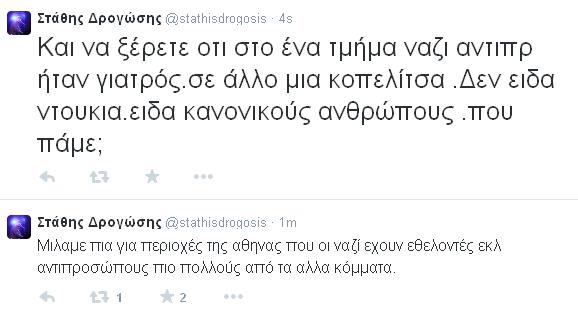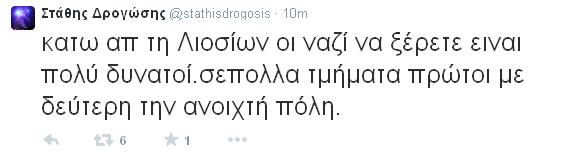 «Κάτω απ τη Λιοσίων οι ναζί να ξέρετε είναι πολύ δυνατοί. Σε πολλά τμήματα πρώτοι με δεύτερη την ανοιχτή πόλη», έγραψε πριν από λίγο στον λογαριασμό του. Και συνέχισε: «Μιλάμε πια για περιοχές της Αθήνας που οι ναζί έχουν εθελοντές εκλογικούς αντιπροσώπους πιο πολλούς από τα άλλα κόμματα».