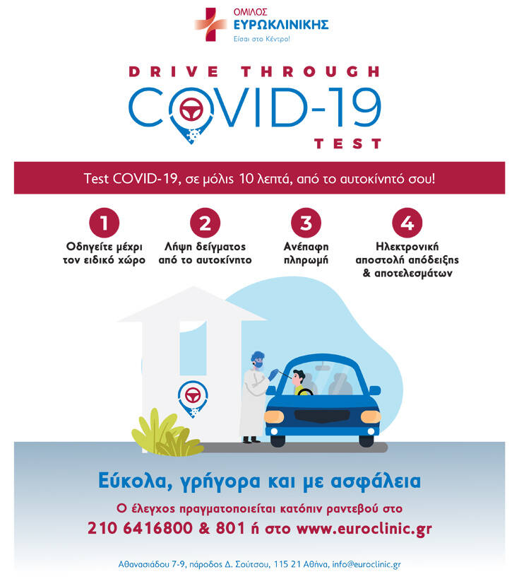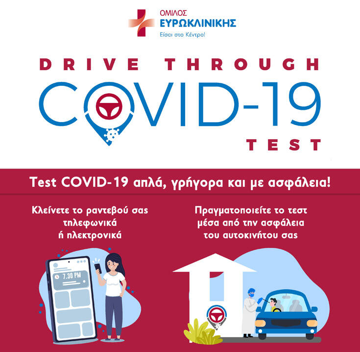 Για να είμαστε λοιπόν ασφαλείς και σίγουροι για την υγεία μας επιλέγουμε πάντα την ασφαλέστερη οδό. Το τεστ Drive-Through COVID-19 του ομίλου Ευρωκλινικής μας επιτρέπει να εξεταστούμε γρήγορα, αξιόπιστα και με την όσο γίνεται λιγότερη επαφή.