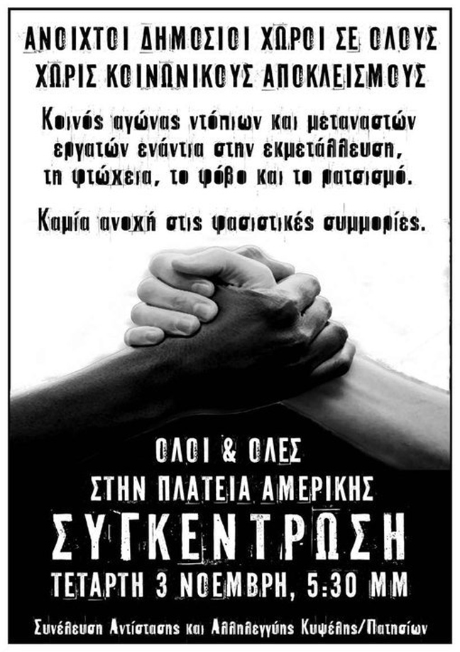 Με κεντρικά συνθήματα «Όχι στους κοινωνικούς αποκλεισμούς» και «Καμία ανοχή στις φασιστικές συμμορίες» αύριο το απόγευμα πραγματοποιείται συγκέντρωση αλληλεγγύης στους μετανάστες. Το «ραντεβού» έχει δοθεί για τις 17:30 στην πλατεία Αμερικής.
