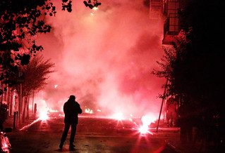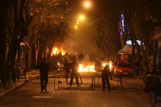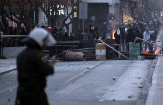 Ακολούθως, λίγο μετά τις οκτώ το βράδυ, ομάδες αντιεξουσιαστών επιδίδονται σε πετροπόλεμο με δυνάμεις των ΜΑΤ που από την πλευρά τους ρίχνουν δακρυγόνα και χειροβομβίδες κρότου – λάμψης. Οι αστυνομικές δυνάμεις προχωρούν σε 8 συλλήψεις, δύο εκ των οποίων αφορούν πλιάτσικο σε σούπερ μάρκετ επί της οδού Σπύρου Μερκούρη.