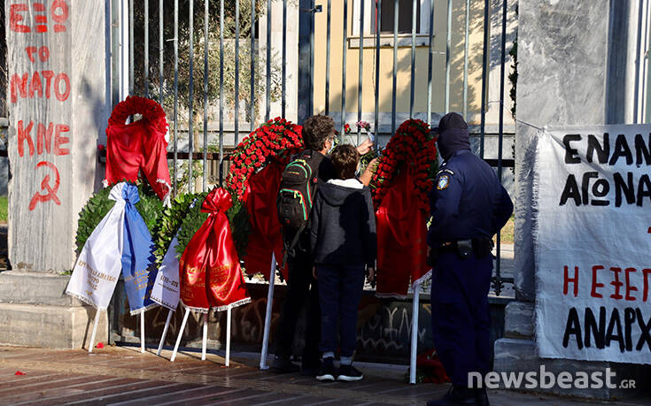 Μάλιστα, στο σημείο βρίσκονται ισχυρές αστυνομικές δυνάμεις, οι οποίες «επιτηρούν» την κατάθεση λουλουδιών για τους ήρωες του Πολυτεχνείου. Ενδεικτικές και πολύ θλιβερές είναι και οι φωτογραφίες του newsbeast.gr που δείχνουν έναν πιτσιρικά να αφήνει με τον πατέρα του ένα γαρύφαλλο ενώ ένας αστυνομικός είναι σε απόσταση αναπνοής.