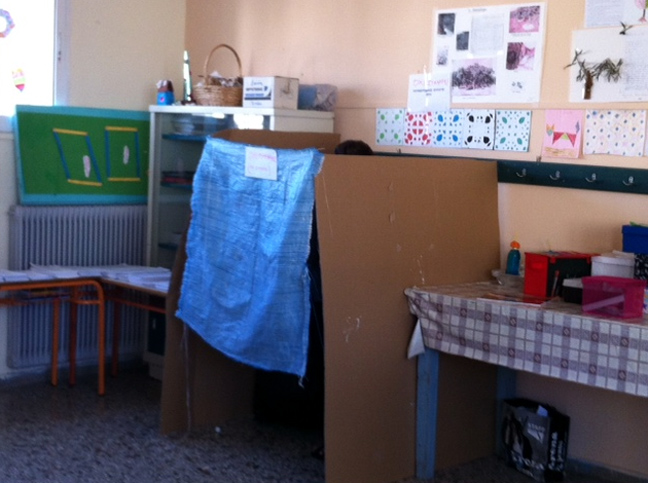 Πήρε δύο κούτες, κρέμασαν και μία λινάτσα και… έτοιμο! Μπορεί βέβαια το παραβάν να θυμίζει την… παράγκα του καραγκιόζη, αυτό που έχει όμως σημασία, είναι ότι εξασφαλίστηκε η λειτουργία της μυστικής ψηφοφορίας.
