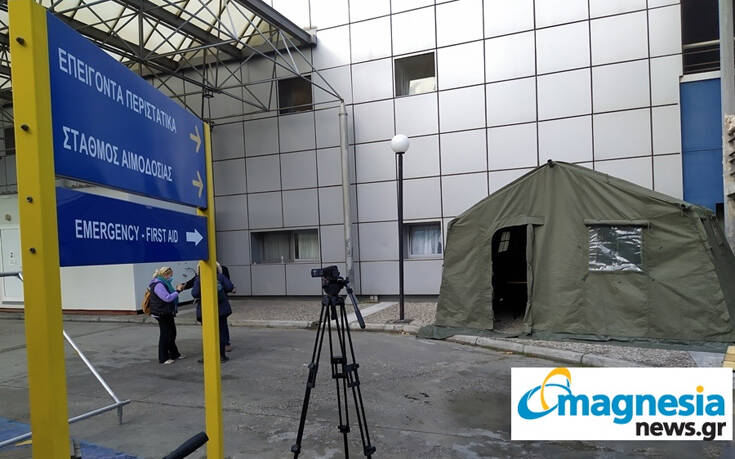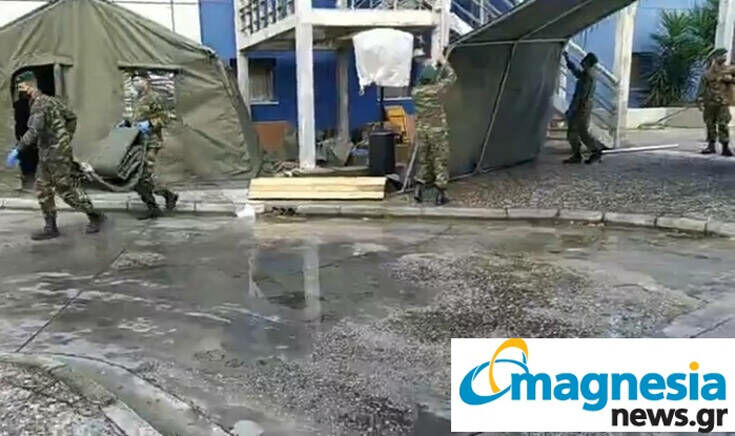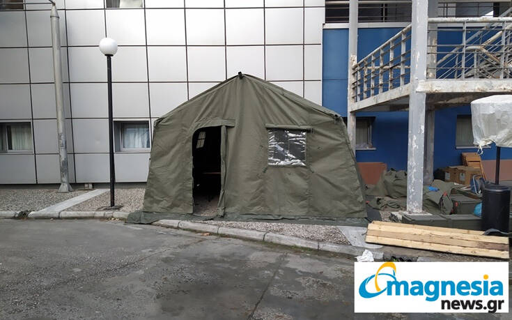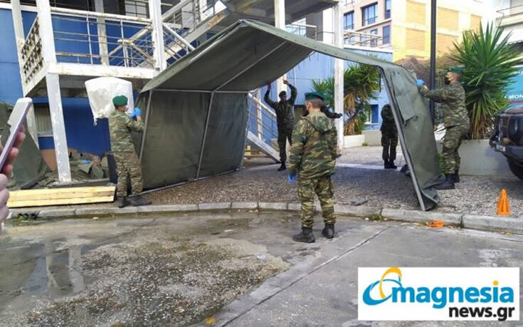 Στρατιωτικές σκηνές στο προαύλιο του νοσοκομείου Βόλου έστησαν από νωρίς το πρωί κλιμάκιο του στρατού και της Ταξιαρχίας Πεζοναυτών.