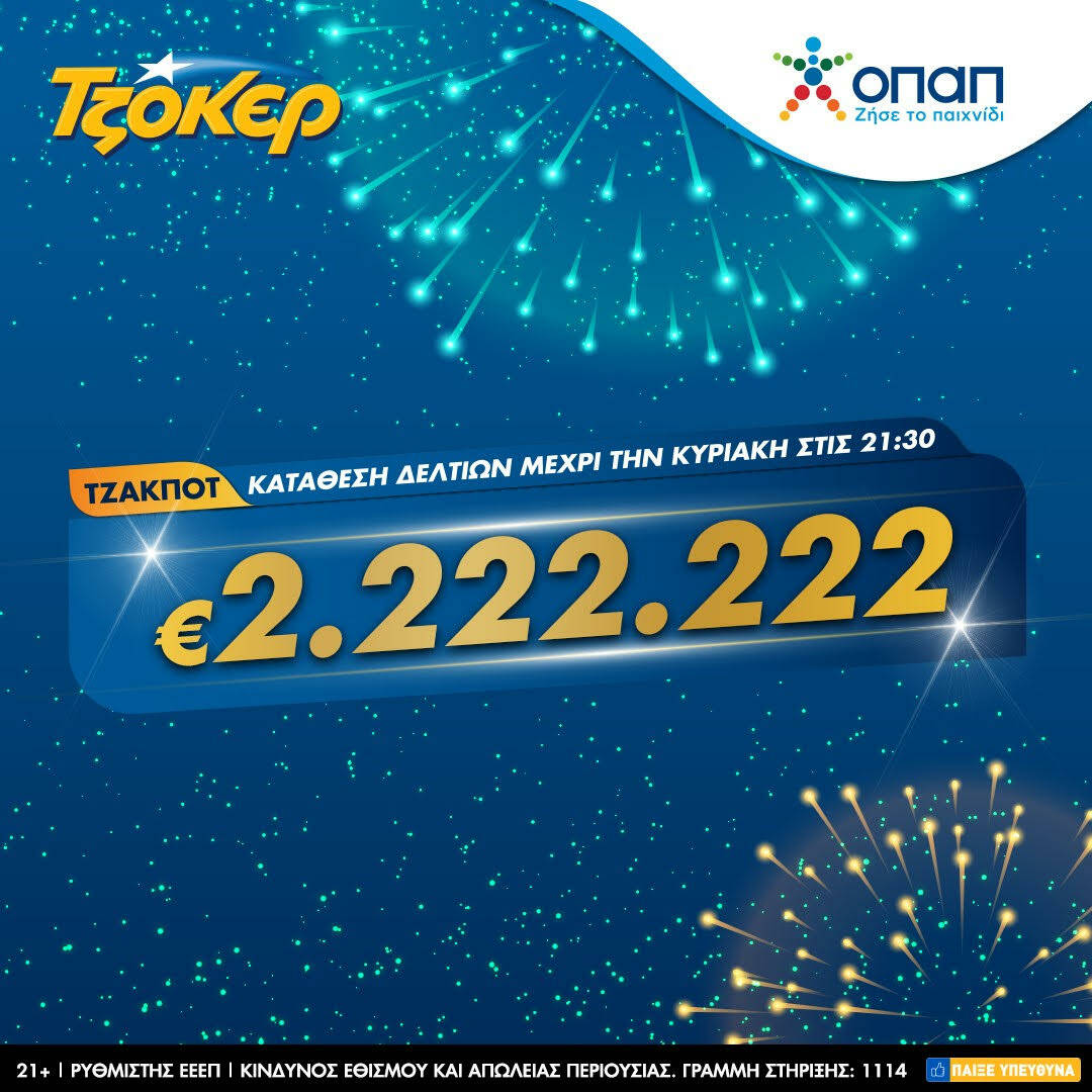 Μόνιμη έξοδο από το lockdown μπορεί να κάνουν ένας ή περισσότεροι τυχεροί του ΤΖΟΚΕΡ απόψε, καθώς το μεγάλο έπαθλο της κλήρωσης του παιχνιδιού έχει εκτοξευτεί στα 2.222.222 ευρώ.