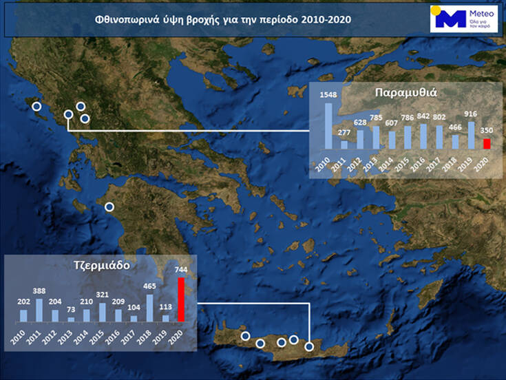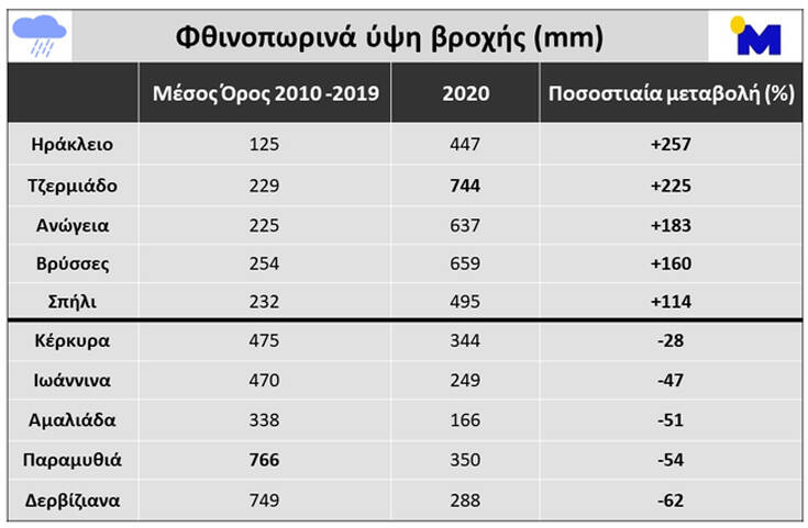 Χαρακτηριστικό είναι ότι ο μετεωρολογικός σταθμός στο Ηράκλειο Κρήτης το φθινόπωρο του 2020 κατέγραψε συνολικά 447 mm, παρουσιάζοντας μια αυξητική ποσοστιαία μεταβολή 257% σε σχέση με το μέσο όρο των φθινοπώρων 2010-2019, ενώ τα χαμηλά ύψη βροχής του φετινού φθινοπώρου στη Δυτική Ελλάδα αποτυπώνονται στο μετεωρολογικό σταθμό στα Δερβίζιανα Ιωαννίνων όπου κατέγραψε 288 mm, παρουσιάζοντας μια μείωση στην ποσοστιαία μεταβολή που φτάνει τα 62%.