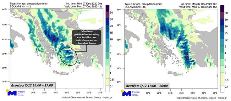 Φαινόμενα, κατά τόπους ισχυρά, αναμένονται κατά το υπόλοιπο της Δευτέρας (07/12) στα ανατολικά και βόρεια ηπειρωτικά και στο Αιγαίο, σύμφωνα με τα τελευταία προγνωστικά δεδομένα του Εθνικού Αστεροσκοπείου Αθηνών. Χιονοπτώσεις θα σημειωθούν στα ορεινά της Ηπείρου, της Μακεδονίας και της Θράκης, ενώ πιθανότητα χαλαζοπτώσεων υπάρχει έως το μεσημέρι κυρίως στις Κυκλάδες, τα Δωδεκάνησα και τα νησιά του Ανατολικού Αιγαίου.