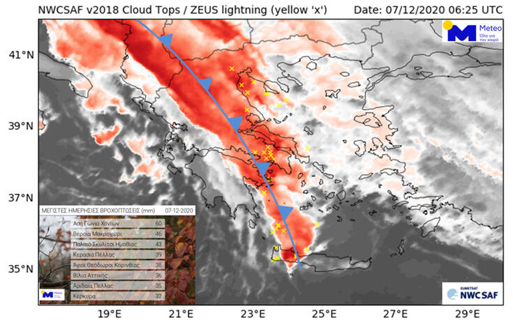 Τα μεγαλύτερα ύψη βροχής καταγράφηκαν από το δίκτυο των αυτόματων μετεωρολογικών σταθμών του Εθνικού Αστεροσκοπείου Αθηνών/meteo.gr σε Ασή Γωνιά Χανίων (60 χιλιοστά), Μακροχώρι Βέροιας (46), Παλαιό Σκυλίτσι Ημαθίας (43), Κερασιά Πέλλας (39), Άγιοι Θεόδωροι Κορινθίας (38) και Βίλια Αττικής (36 χιλιοστά).