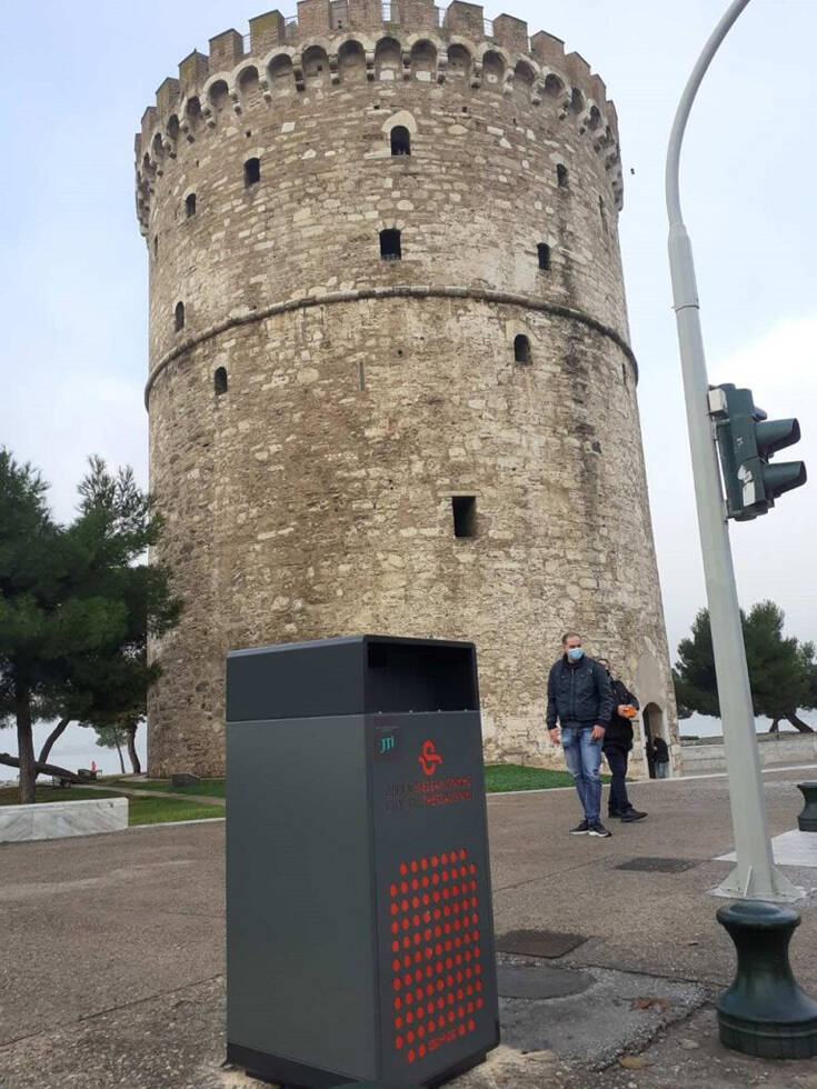 Τα νέα καλαθάκια, που έχουν σχεδιαστεί ειδικά για τον δήμο Θεσσαλονίκης, αναπτύσσονται στην παραλιακή ζώνη στο τμήμα από την πλατεία Λευκού Πύργου μέχρι και το ύψος του κτιρίου του Ελληνικού Ερυθρού Σταυρού.