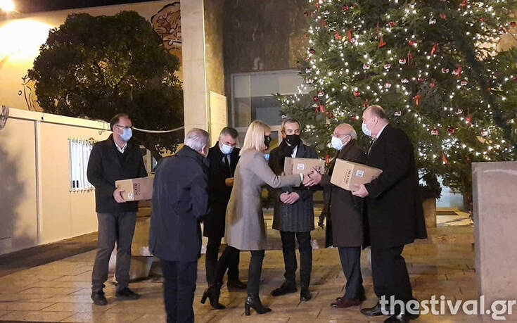 Ο δήμαρχος Θεσσαλονίκης προσφέρει υγειονομικό υλικό στο διοικητικό προσωπικό αστειευόμενος είπε «για φέτος έχει ένα είδος αλκοόλ που δεν μπορούμε να πιούμε, ελπίζω του χρόνου να προσφέρουμε κανονικό αλκοόλ».