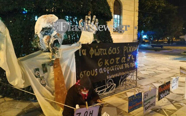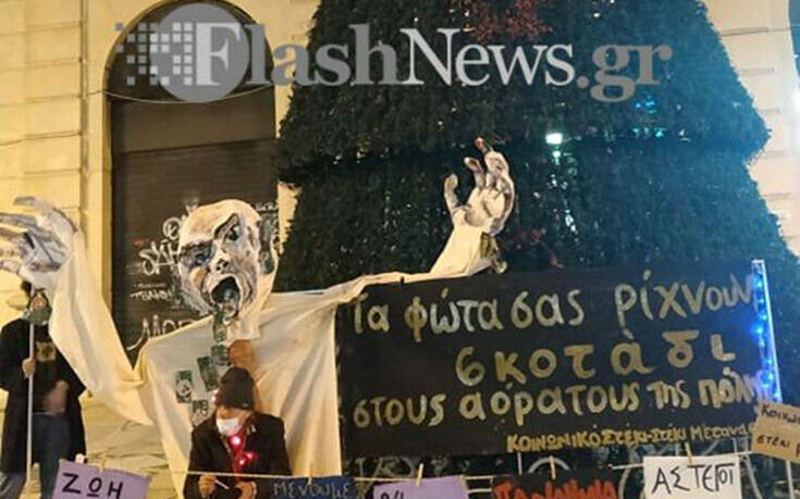 «Τα φώτα σας ρίχνουν σκοτάδι στους αόρατους της πόλης» ανέφερε ένα από τα πανό τα οποία τοποθετήθηκαν μπροστά από το χριστουγεννιάτικο δέντρο.