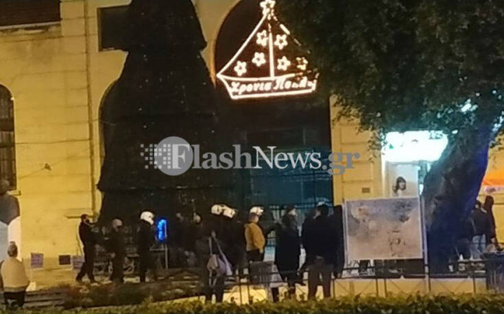 Λίγο πριν ξεκινήσει η διαδικτυακή εκδήλωση στην πλατεία της Αγοράς στα Χανιά, για τη φωταγώγηση του χριστουγεννιάτικου δέντρου πραγματοποιήθηκε διαμαρτυρία μπροστά από το δέντρο.