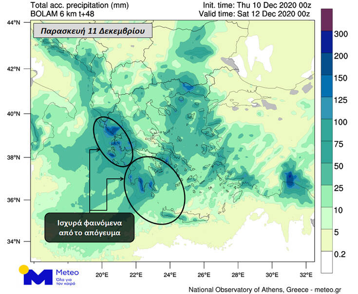 Στο χάρτη παρουσιάζεται η ολική βροχόπτωση που αναμένεται έως το βράδυ της Παρασκευής 11/12 καθώς και οι περιοχές που θα σημειωθούν ισχυρά φαινόμενα.