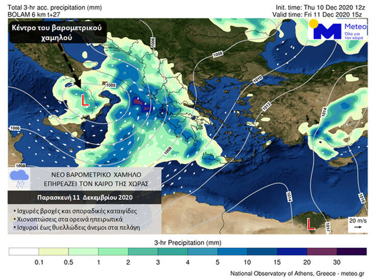 Στο χάρτη που ακολουθεί παρουσιάζεται η θέση του βαρομετρικού χαμηλού, η βροχή και ο άνεμος που αναμένεται το μεσημέρι της Παρασκευής 11/12.