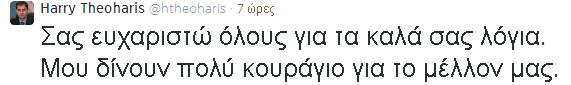 «Σας ευχαριστώ όλους για τα καλά σας λόγια. Μου δίνουν πολύ κουράγιο για το μέλλον μας», αναφέρει στο «τιτίβισμά» του ο κ. Θεοχάρης.