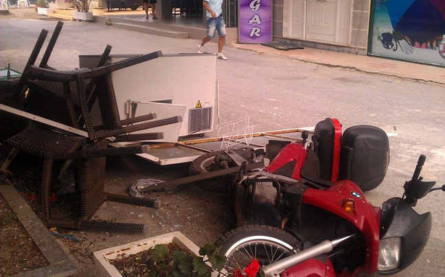 Σπασμένες βιτρίνες, ξεριζωμένα δέντρα, αναποδογυρισμένοι κάδοι και πινακίδες είναι μερικά από αυτά που άφησε πίσω του το ολιγόλεπτο μπουρίνι που ξέσπασε χθες το μεσημέρι στην Κατερίνη .