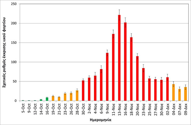 Οι αναλύσεις στα δείγματα που ελήφθησαν στις 4, 7 και 9 Δεκεμβρίου τοποθετούν όλες το ιικό φορτίο στο πορτοκαλί επίπεδο, αν και το διάγραμμα δείχνει πως η κάθοδος της καμπύλης, όχι μόνο δεν είναι αντίστοιχη της τάσης που είχε στη δυναμική της ανόδου, αλλά και παρουσιάζει διακυμάνσεις.