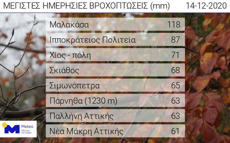 Στον πίνακα που ακολουθεί παρουσιάζονται τα οκτώ μεγαλύτερα ύψη βροχόπτωσης, έως τις 09:00 το πρωί.