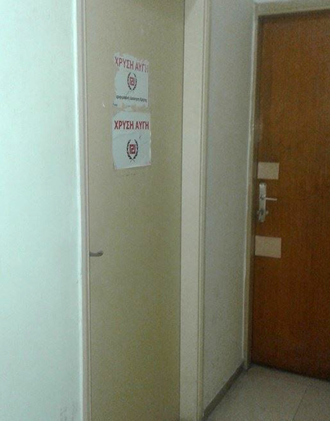 Άγνωστοι είχαν τοποθετήσει στην πόρτα των γραφείων της Χρυσής Αυγής μια σφαίρα, ένα σπαθί και ένα μαχαίρι, ένα κομποσκοίνι και αυτοκόλλητα καθώς και ένα φύλλο πορείας στρατού.