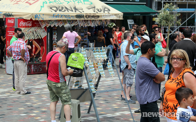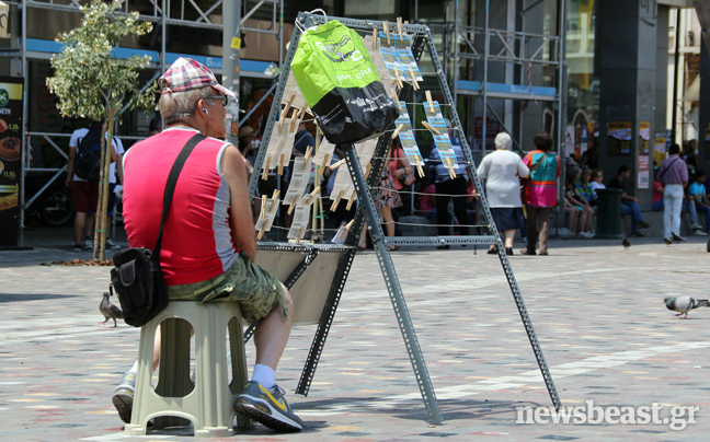 Εκτός από τα δρώμενα βέβαια, στους «μόνιμους κατοίκους» της πλατείας ανήκουν και οι λαχειοπώλες που προσπαθούν να βιοποριστούν πουλώντας «ελπίδα» μερικών εκατομμυρίων σε όσους θέλουν να δοκιμάσουν την τύχη τους. Η δουλειά είναι δύσκολη, αναφέρει ο κ. Γιώργος που εδώ και χρόνια στέκεται σχεδόν καθημερινά στην πλατεία στο Μοναστηράκι. «Μες το λιοπύρι όλη μέρα για να βγάλεις ένα μικρό μεροκάματο… Άλλωστε ο κόσμος δεν αγοράζει πια τόσο συχνά λαχεία. Μ’ όλα αυτά που συμβαίνουν έπαψε ίσως να πιστεύει στην θεά τύχη…».