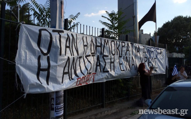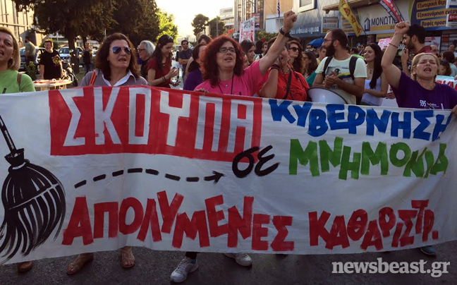 Στις διαμαρτυρίες στην Αγία Παρασκευή συμμετέχουν και οι απολυμέρες καθαρίστριες. Στο σημείο έχει τοποθετηθεί και βήμα για τις ομιλίες, καθώς στη συγκέντρωση αναμένεται να βρεθεί ο αρχηγός του ΣΥΡΙΖΑ, Αλέξης Τσίπρας
