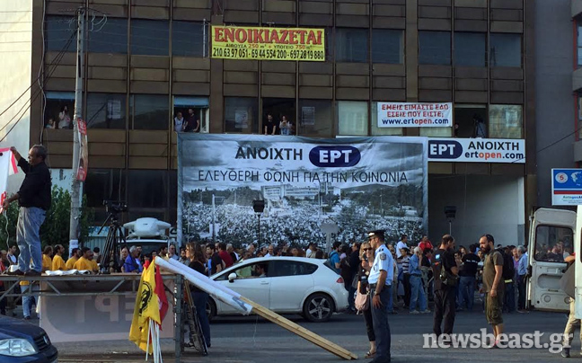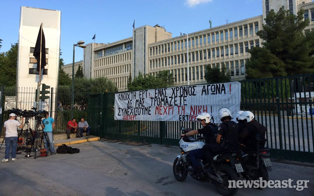 Ένας χρόνος συμπληρώνεται σήμερα από το «μαύρο» στην ΕΡΤ, και πρώην εργαζόμενοι και συνδικάτα καλούν σε συγκέντρωση έξω από το Ραδιομέγαρο. Αυτή την ώρα περίπου 200-300 άτομα βρίσκονται στα έξω από το κτίριο, ενώ μέχρι στιγμής είναι κλειστή η Μεσογείων στο ρεύμα προς Αθήνα.