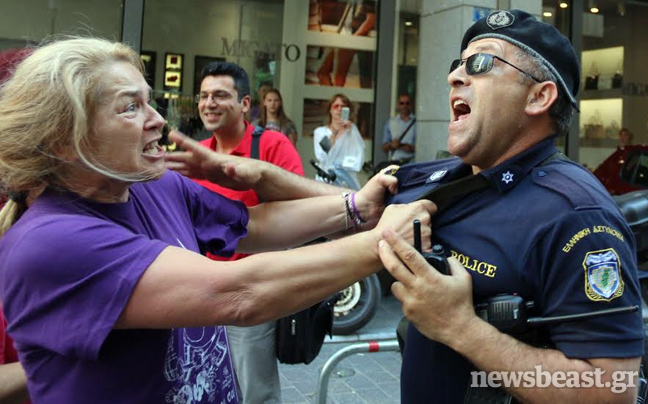Η καθαρίστρια χθες φωτογραφήθηκε τη στιγμή που τραβούσε από το γιακά αστυνομικό