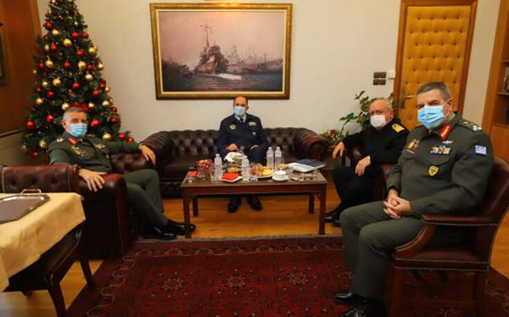 Τέλος αντάλλαξε ευχές στο γραφείο του με τους αρχηγούς των Γενικών Επιτελείων και προσωπικό του επιτελείου ΓΕΕΘΑ.