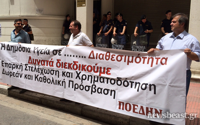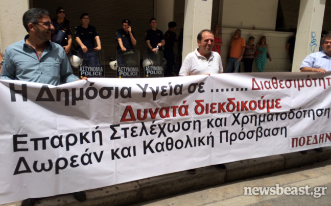 Πορεία πραγματοποιούν αυτή την ώρα εργαζόμενοι στα δημόσια νοσοκομεία. Οι εργαζόμενοι που συγκεντρώθηκαν έξω από το υπουργείο Υγείας κατευθύνονται αυτή την ώρα προς τις απολυμένες καθαρίστριες και στη συνέχεια θα μεταβούν στο υπουργείο Διοικητικής Μεταρρύθμισης.