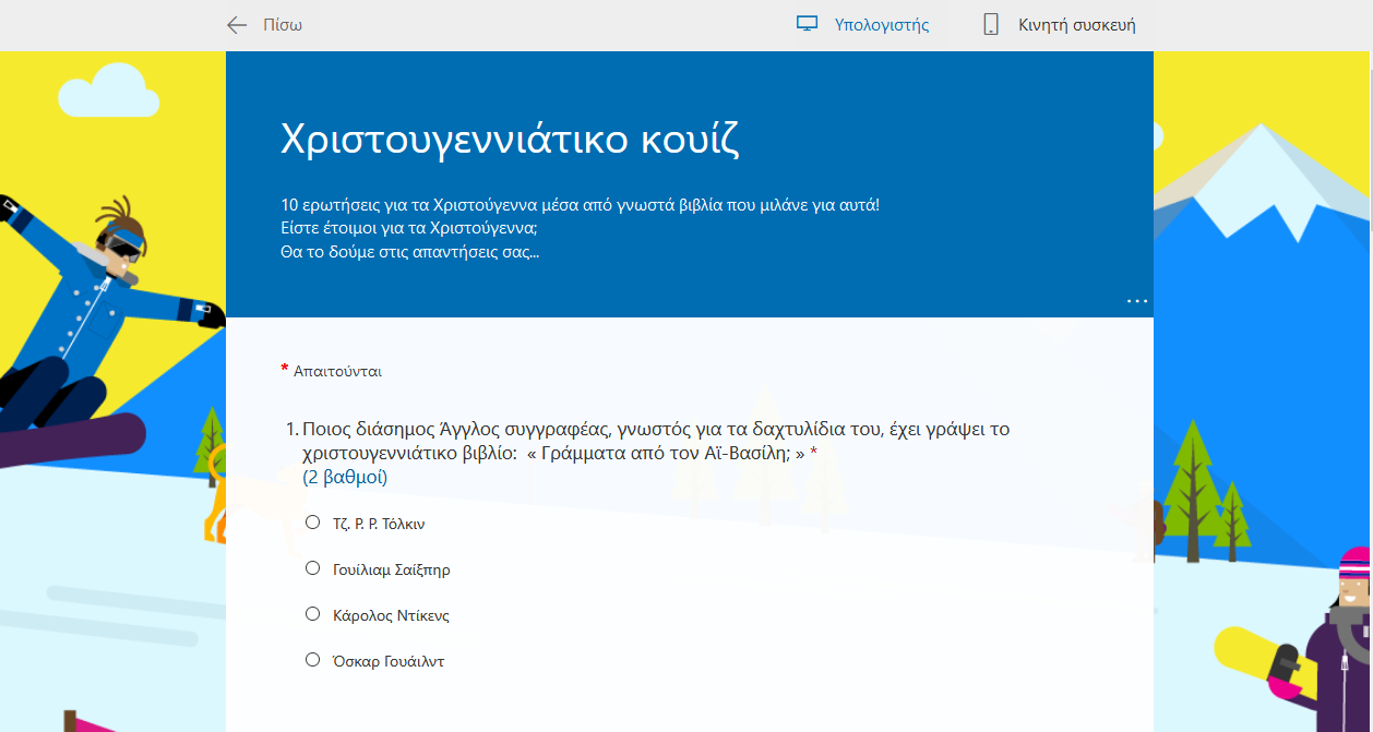 Η πρωτοβουλία αυτή συμπληρώνεται από ένα διαδικτυακό χριστουγεννιάτικο κουίζ, που βασίστηκε σε μια ιδέα του βιβλιοθηκονόμου κ. Κουμαντάκη, με ερωτήσεις σχετικά με χριστουγεννιάτικες ιστορίες και τους συγγραφείς τους. Το κουίζ αυτό παρέχει σε όσους το κάνουν ενδιαφέρουσες γνώσεις γύρω από σπουδαίους συγγραφείς και το έργο τους.