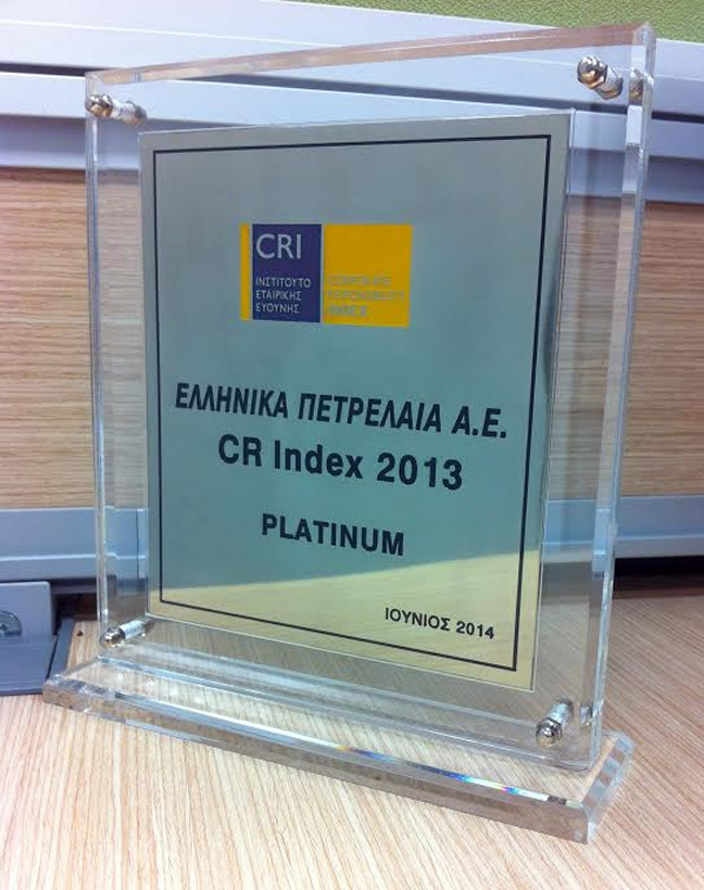 Για τέταρτη συνεχή χρονιά, ο Όμιλος Ελληνικά Πετρέλαια συμμετείχε στην αξιολόγηση, βάσει του Εθνικού Δείκτη Εταιρικής Ευθύνης (CR Index) και διακρίθηκε στην υψηλότερη κατηγορία PLATINUM για τις επιδόσεις του στην Εταιρική Κοινωνική Ευθύνη, βελτιώνοντας ακόμα περισσότερο την διάκριση GOLD της προηγούμενης χρονιάς.