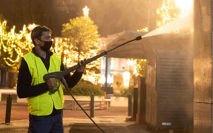 O καθαρισμός σε ρολά καταστημάτων έγινε σε συνεννόηση με τους ιδιοκτήτες, ενώ οι εργασίες πραγματοποιήθηκαν την νύχτα ώστε να μην εμποδίζεται η λειτουργία τους.