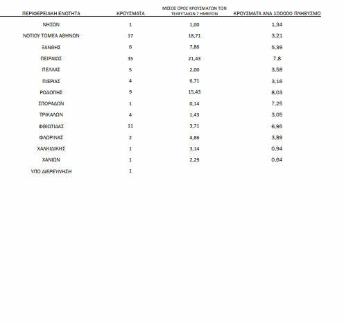 Η ανακοίνωση του ΕΟΔΥ: «Ο ΕΟΔΥ ανακοίνωσε 427 νέα κρούσματα της λοίμωξης του νέου κορωνοϊού (COVID-19), εκ των οποίων 9 εντοπίστηκαν κατόπιν ελέγχων στις πύλες εισόδου της χώρας. Ο συνολικός αριθμός των κρουσμάτων ανέρχεται στα 140526, εκ των οποίων 52.3% άνδρες. Κατά την ιχνηλάτιση βρέθηκε ότι 5478 (3.9%) θεωρούνται σχετιζόμενα με ταξίδι από το εξωτερικό και 42054 (29.9%) είναι σχετιζόμενα με ήδη γνωστό κρούσμα.