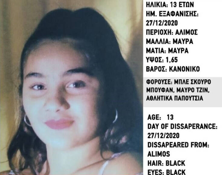 «Στις 27/12/2020, εξαφανίστηκε την περιοχή του Αλίμου όπου η διαμένει, η ανήλικη Αικατερίνη Δ. , 13 ετών. Η Αικατερίνη Δ. έχει ύψος 1,65 μ., κανονικό βάρος, έχει μαύρα μαλλιά και μαύρα μάτια.